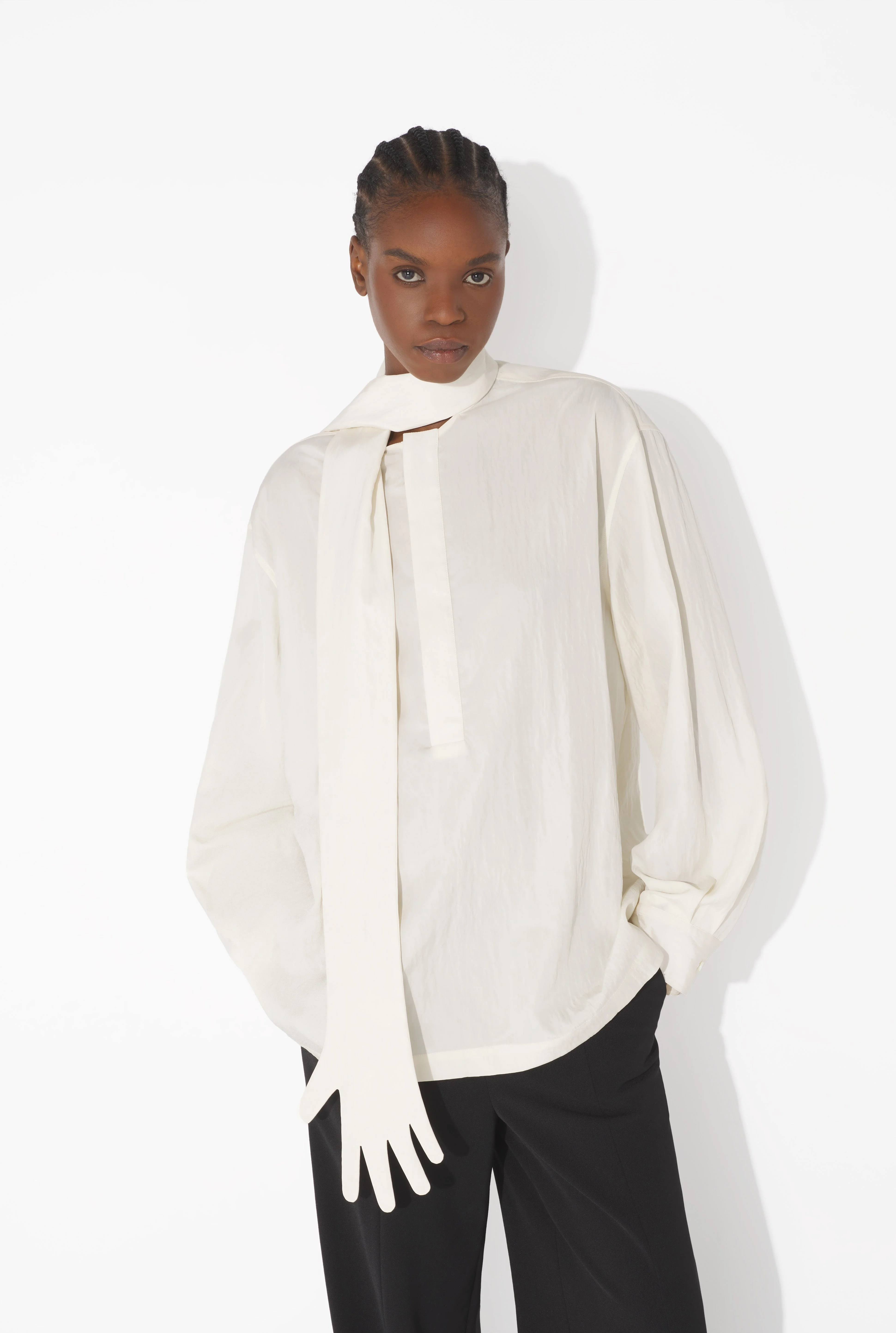 Ecru wrinkled-effect flowy blouse with built-in glove-shaped scarf. PRODUCT DETAILS - Fitted cut - Mother-of-pearl button fastening under placket - Mother-of-pearl cuff buttons - Materials: 65% lyocell, 35% polyamide - Made in Italy - Reference : 25/03-W-ST027-W009-03