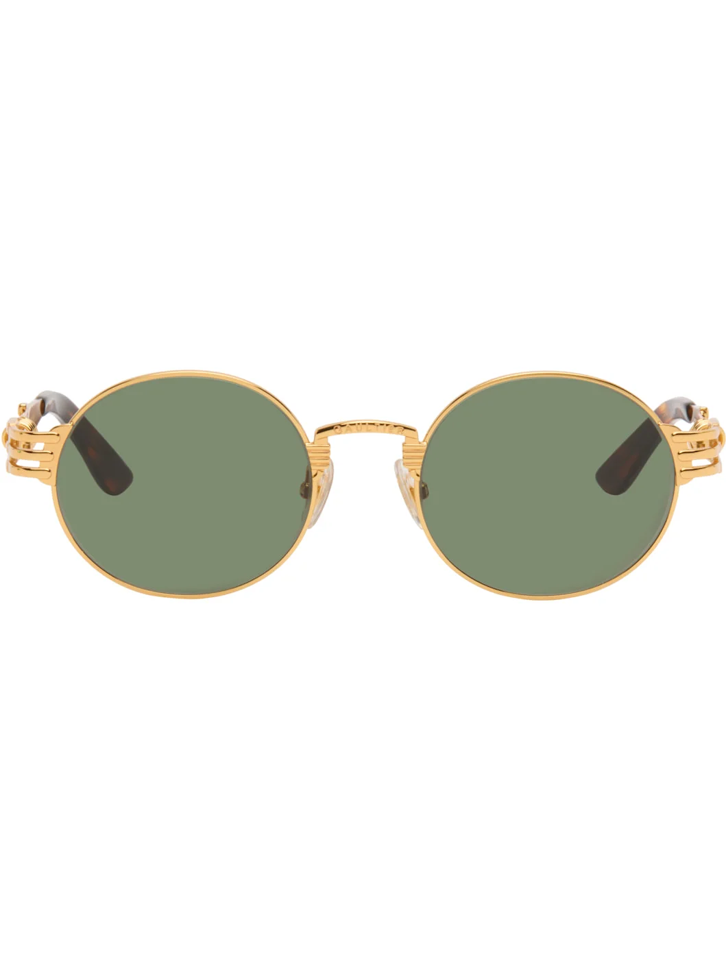 Oval stainless steel-frame sunglasses. · Black lenses, category 3 · UVA/UVB protection · Logo-etched bridge · Adjustable rubber nose pads · Coil hardware at temples · Mazzucchelli tortoiseshell acetate temple tips · Core wire at tips · Velvet-lined leather case with interior mirror · Size: 51.23 Supplier color: Black Stainless steel. Made in France 252808F005005