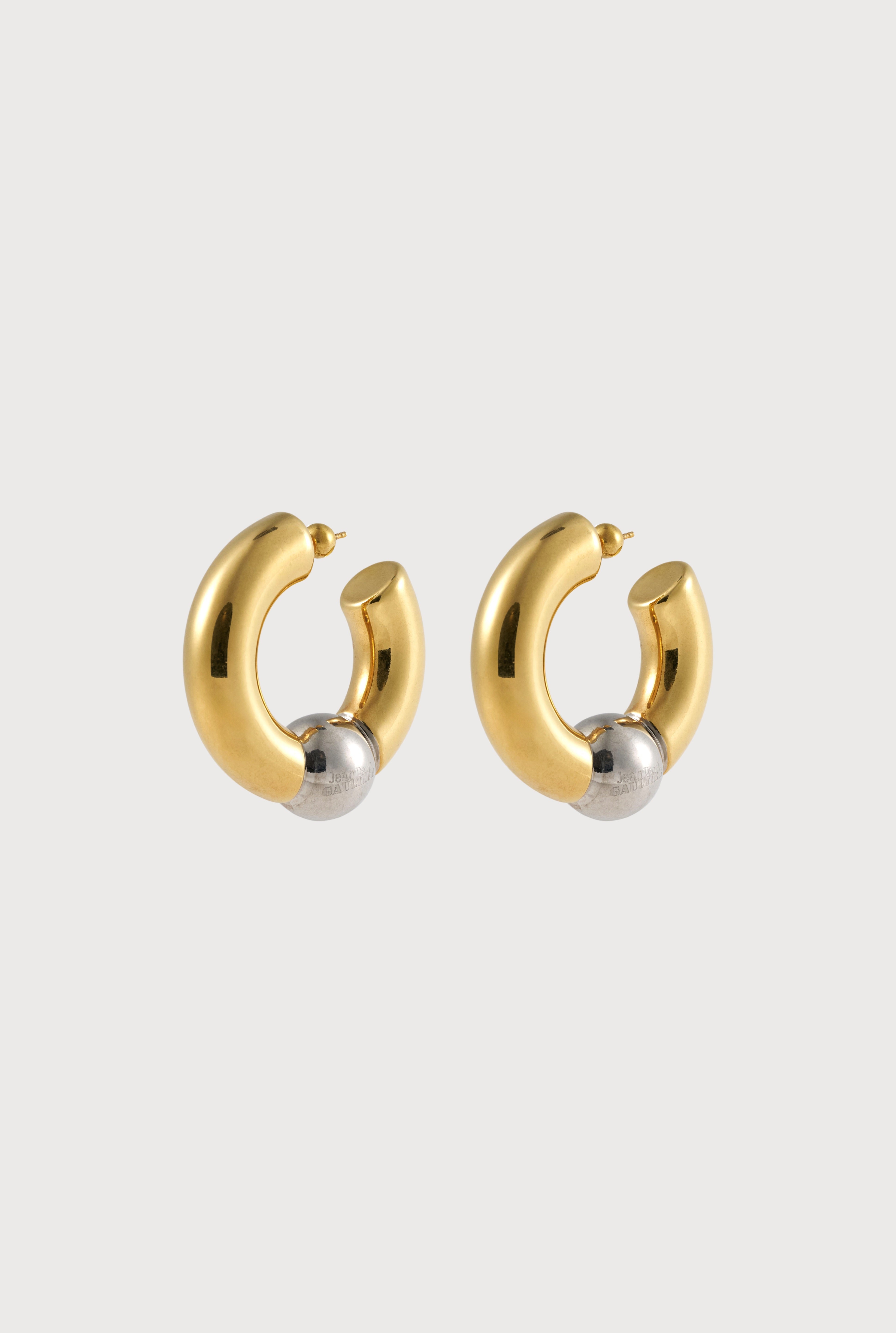 Gaultier TV Collection Two-toned brass tube earrings with Jean Paul Gaultier engraving. PRODUCT DETAILS - Sold as a pair - Push-back clasp - Material: 100% brass - Made in Italy