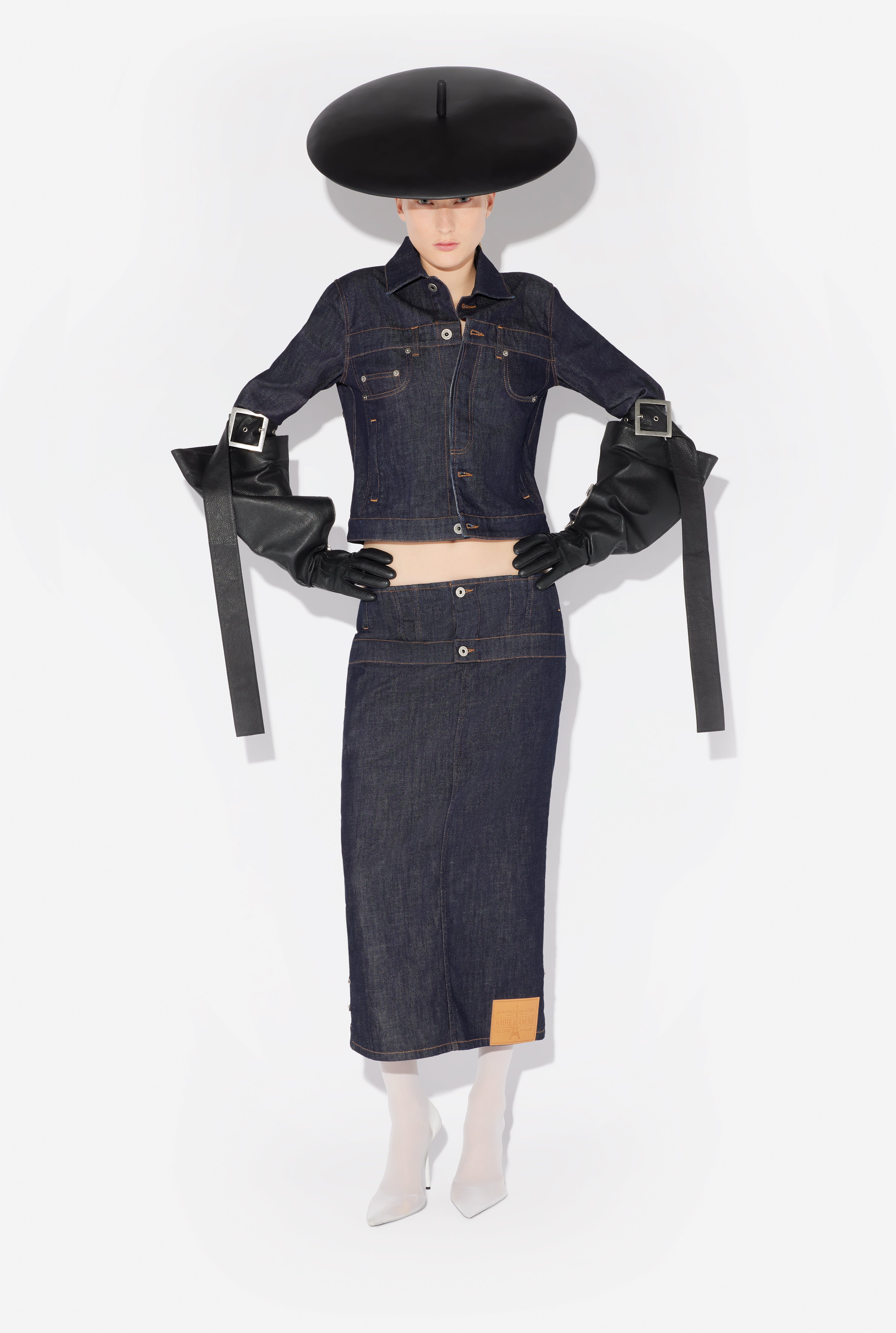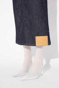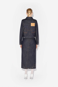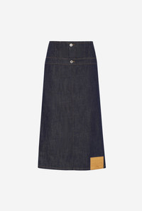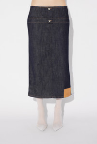 Blue denim skirt with inverted effect and leather Haute Jeanerie label on front. PRODUCT DETAILS - Straight fit - Metallic button fastening with Jean Paul Gaultier engraving - Engraved Jean Paul Gaultier rivets - Materials: 98% cotton, 2% elastane - Made in Italy - Reference: 25/33-F-JU146-D019-55