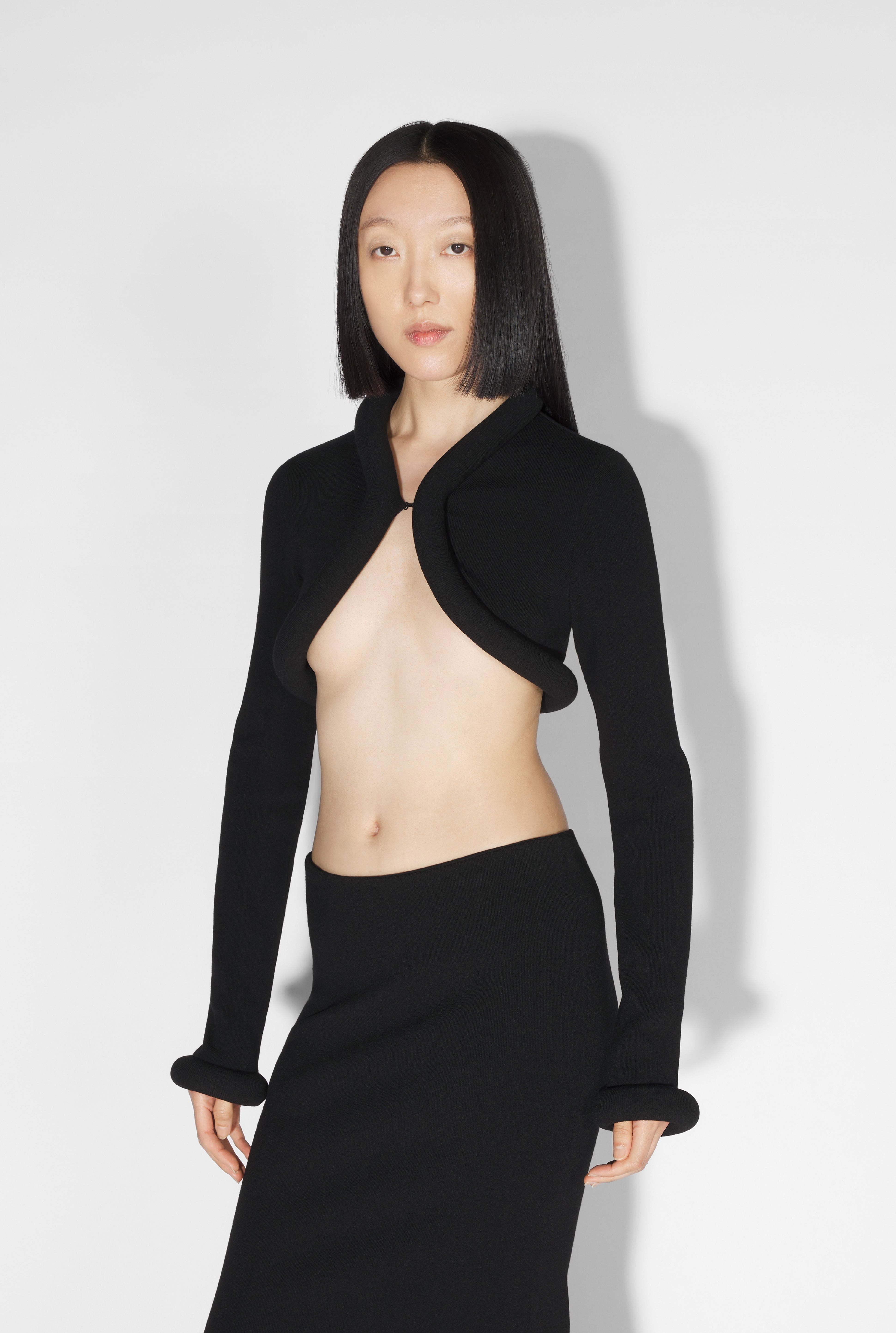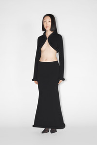 Fashion Fiction Collection Cropped black knit cardigan with 3D finishes. PRODUCT DETAILS - Fitted cut - Hook fastening - Materials: 70% viscose, 30% polyester - Made in Italy