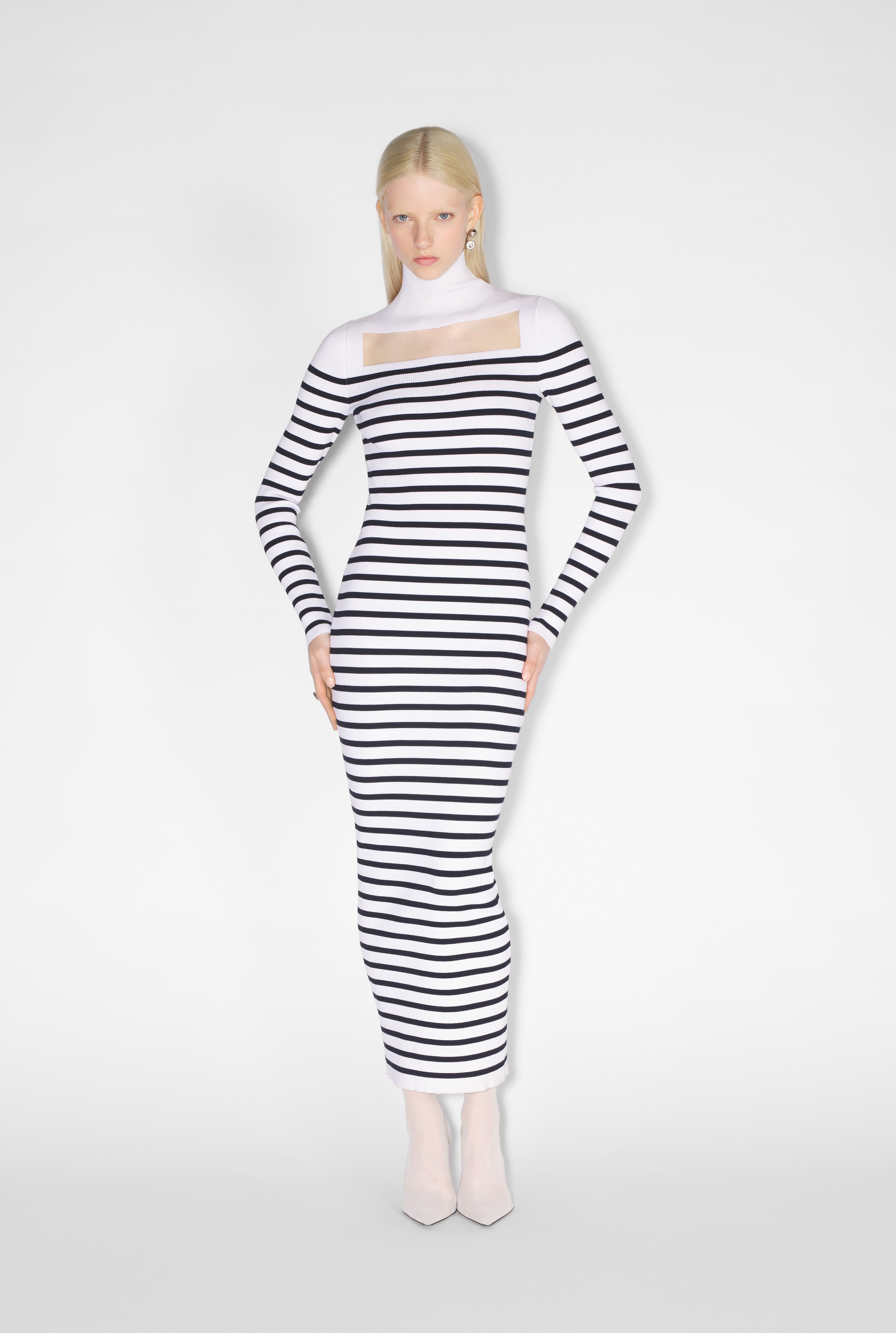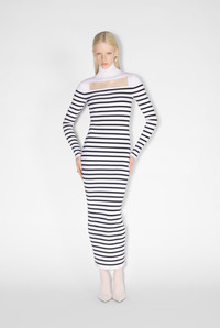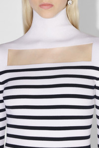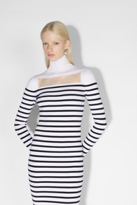 Fashion Fiction Collection Long-sleeved knit Marinière dress with sheer detail on front. PRODUCT DETAILS - Slim fit - Turtleneck - Materials: 70% viscose, 30% polyester - Made in Italy