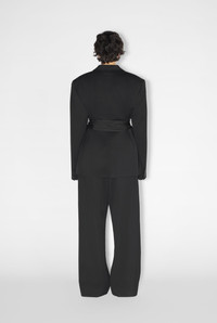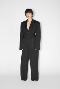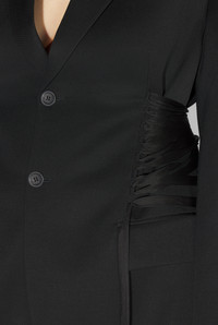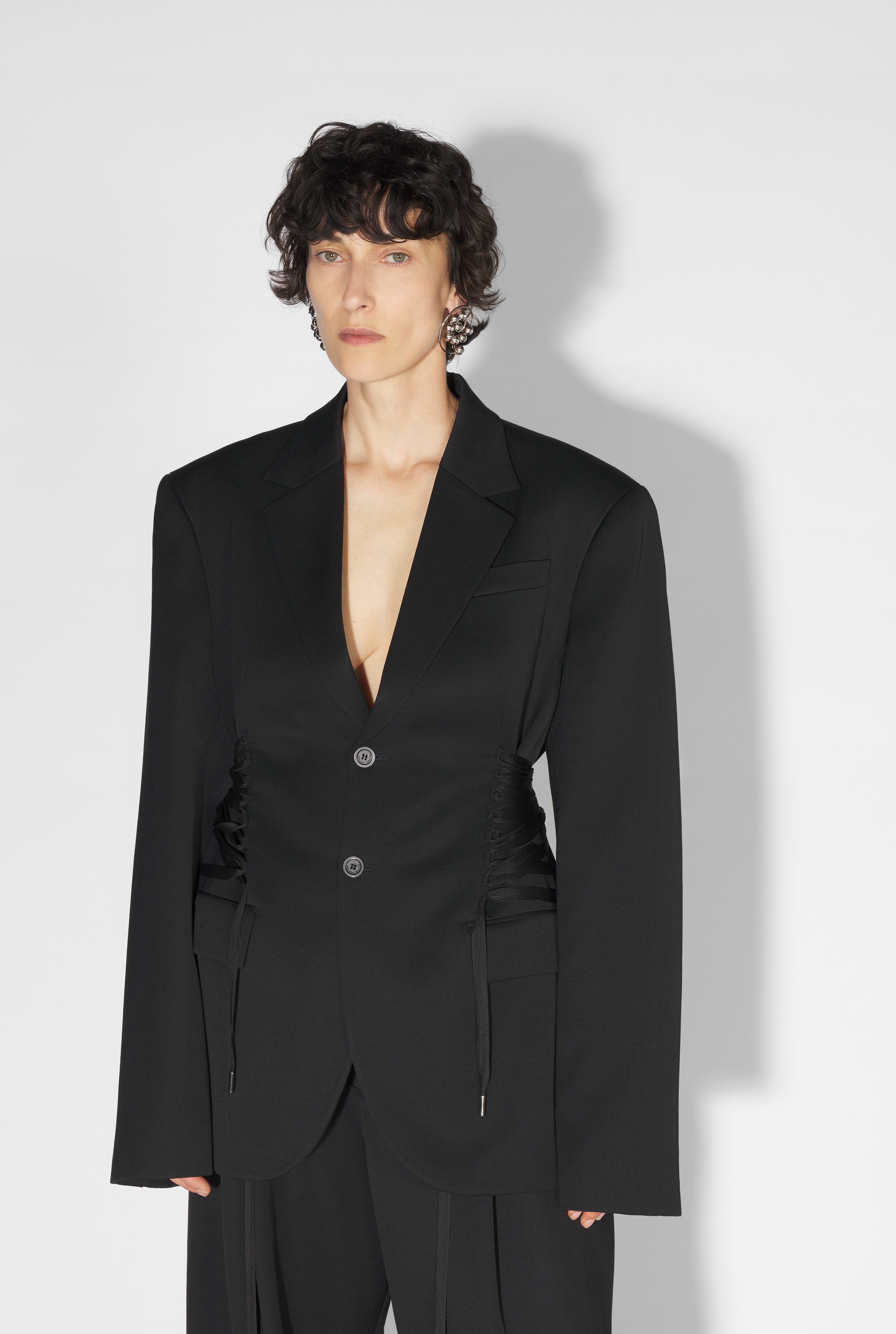 Fashion Fiction Collection Black wool suit jacket with lace-up details on sides. PRODUCT DETAILS - Loose fit - Shoulder pads - Two-button fastening - A ticket pocket - Two flap pockets - Lace-up design on sides - Material: 100% wool - Lining: 100% viscose - Made in Italy