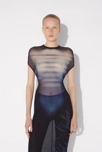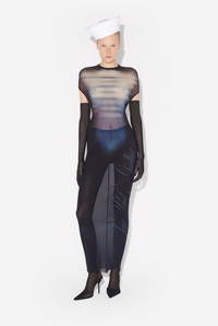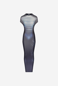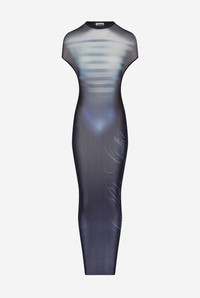 Long open-backed gathered blue tulle dress with “Le Male” print. PRODUCT DETAILS - Tight fit - Crew neck - Stretchy material - Material: 100% polyamide - Made in Italy - Reference: 25/33-F-RO355-T576-595601