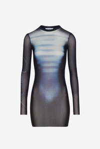 Short blue tulle dress with “Le Male” print. PRODUCT DETAILS - Tight fit - Crew neck - Stretchy material - Long sleeves - Material: 100% polyamide - Made in Italy - Reference: 25/33-F-RO367-T576-595601