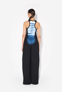 Blue ribbed cotton tank top with “Le Male” print and overalls-inspired buckles with Jean Paul Gaultier engraving. PRODUCT DETAILS - Tight fit - Ribbing - Screen print - Materials: 95% cotton, 5% elastane - Made in Portugal - Reference: 25/33-F-DB051I-J581-0050