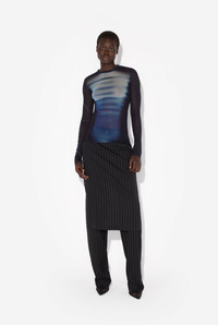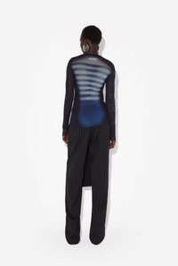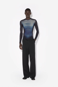 Long-sleeved blue tulle top with “Le Male” print. PRODUCT DETAILS - Tight fit - Crew neck - Stretchy material - Material: 100% polyamide - Made in Italy - Reference: 25/33-F-TO257-T576-595601
