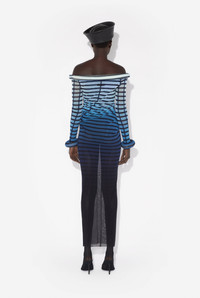 Long twisted blue tulle gradient dress with Mariniere stripe print and 3D-finished cuff and collar details. PRODUCT DETAILS - Tight twisted fit - Boat neck - Stretchy material - Long sleeves - Main material: 100% polyamide - Secondary materials: 80% polyamide, 20% elastane - Made in Italy - Reference: 25/33-F-RO294-T575-005956