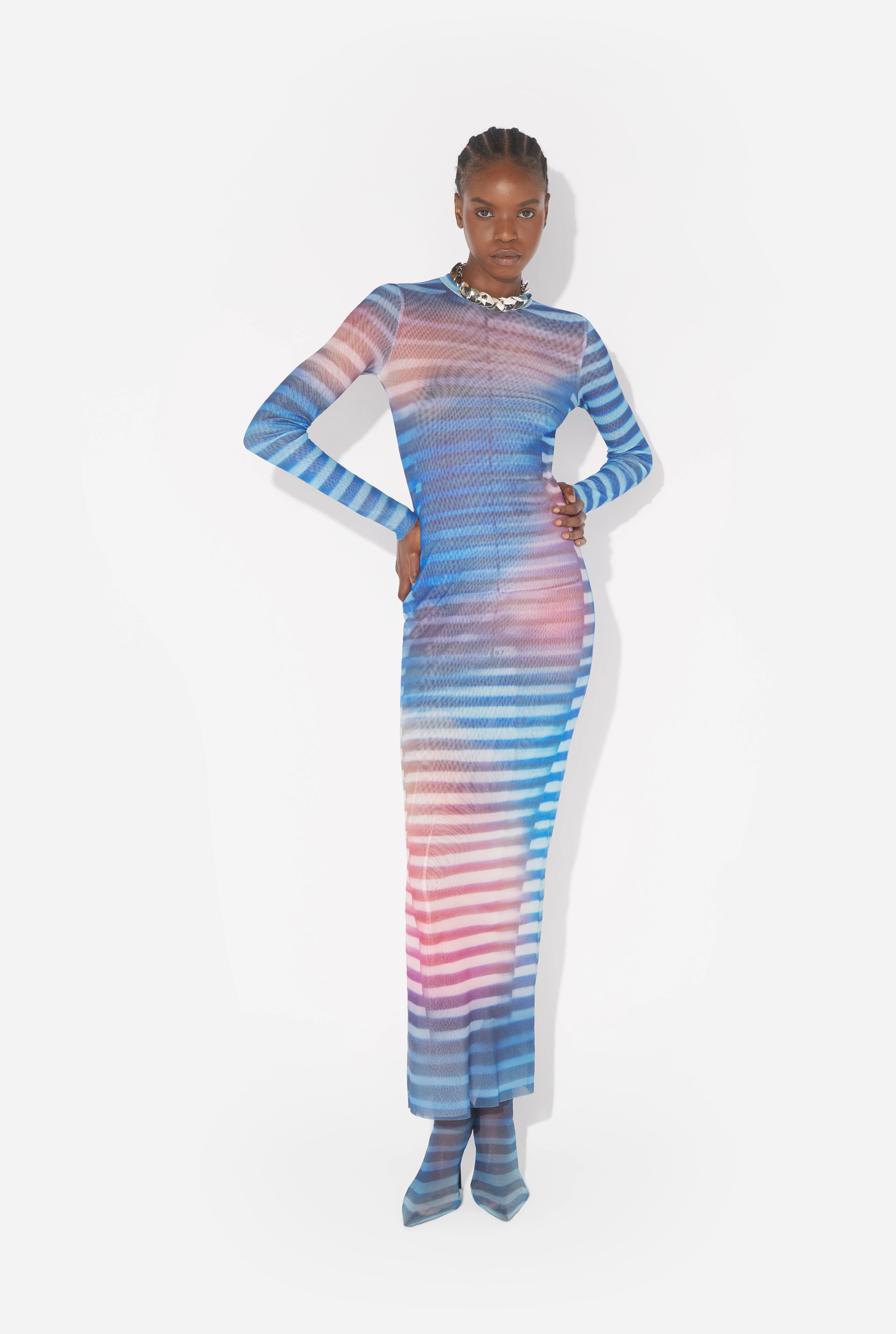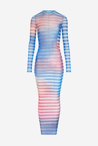Long blue tulle dress with “Air” print. PRODUCT DETAILS - Tight fit - Crew neck - Stretchy material - Long sleeves - Tulle lining - Material: 100% polyamide - Made in Italy - Reference : 25/03-W-DR030-M005P-565034