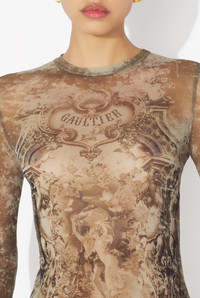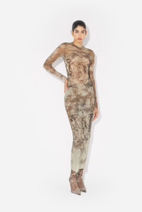 Long beige tulle dress with “Medaillon” print. PRODUCT DETAILS - Tight fit - Crew neck - Stretchy material - Long sleeves - Material: 100% polyamide - Made in Italy - Reference : 25/03-W-DR023-M006P-6965