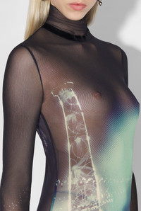 Fashion Fiction Collection Long dress in blue and black tulle with pigalle print. PRODUCT DETAILS - Tight fit - Turtleneck - Stretchy material - Long sleeves - Material: 100% polyamide - Made in Italy