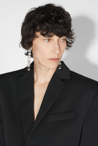 Fashion Fiction Collection Pendant brass earrings decorated with crystals and engraved Jean Paul Gaultier logo. PRODUCT DETAILS - Sold as a pair - Materials: 80% brass, 20% crystal - Made in Italy