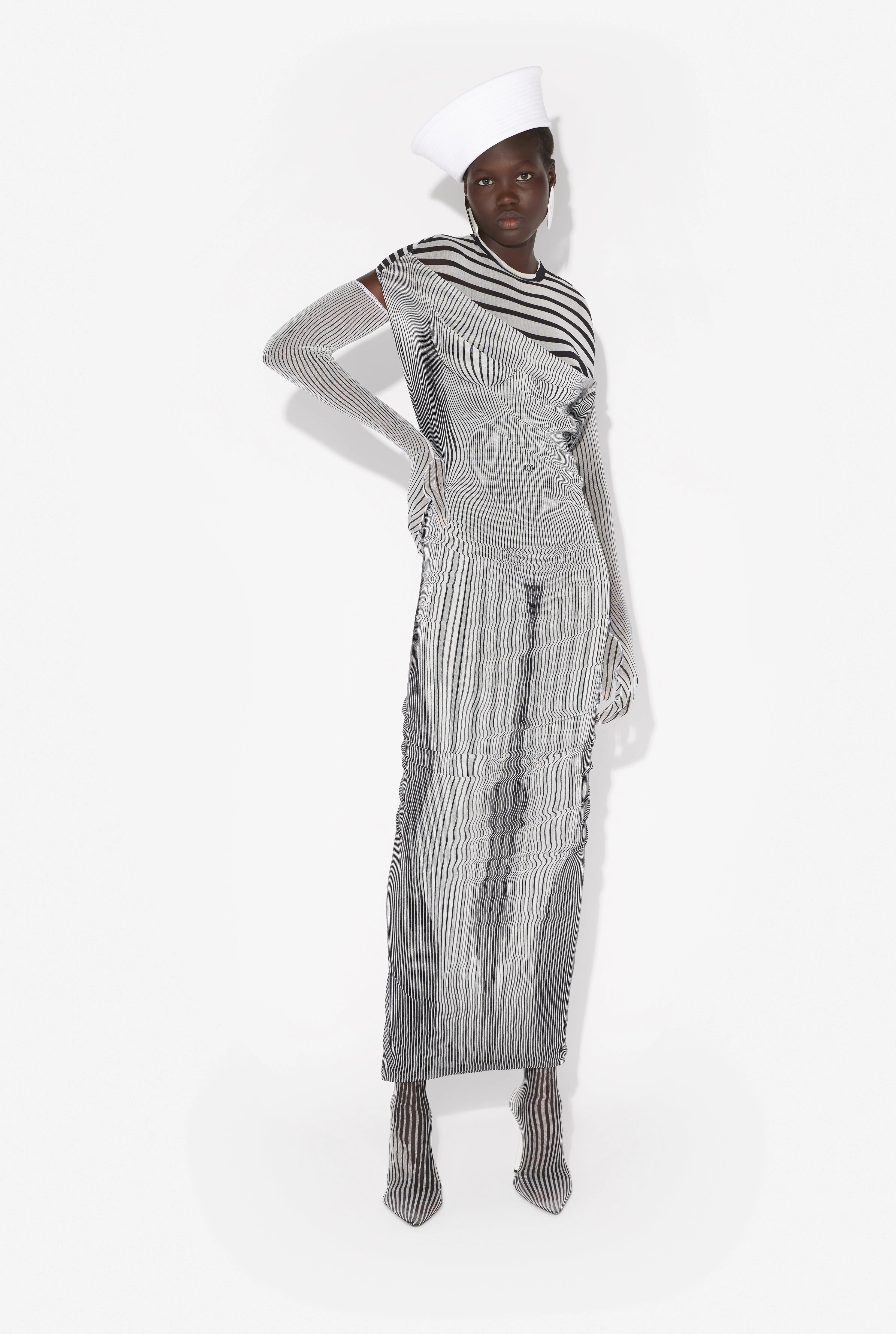 Long open-backed ecru tulle dress, black stripes on body and draped tulle on front. PRODUCT DETAILS - Tight fit - Crew neck - Stretchy material - Material: 100% polyamide - Made in Italy - Reference: 25/33-F-RO357-T578-0100