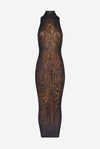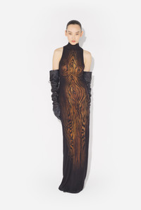 Long black tulle dress with “Wood” print and draped tulle in back. PRODUCT DETAILS - Tight fit - Mock turtleneck - Stretchy material - Long sleeves - Tulle lining - Material: 100% polyamide - Made in Italy - Reference : 25/03-W-DR029-M002P-0060