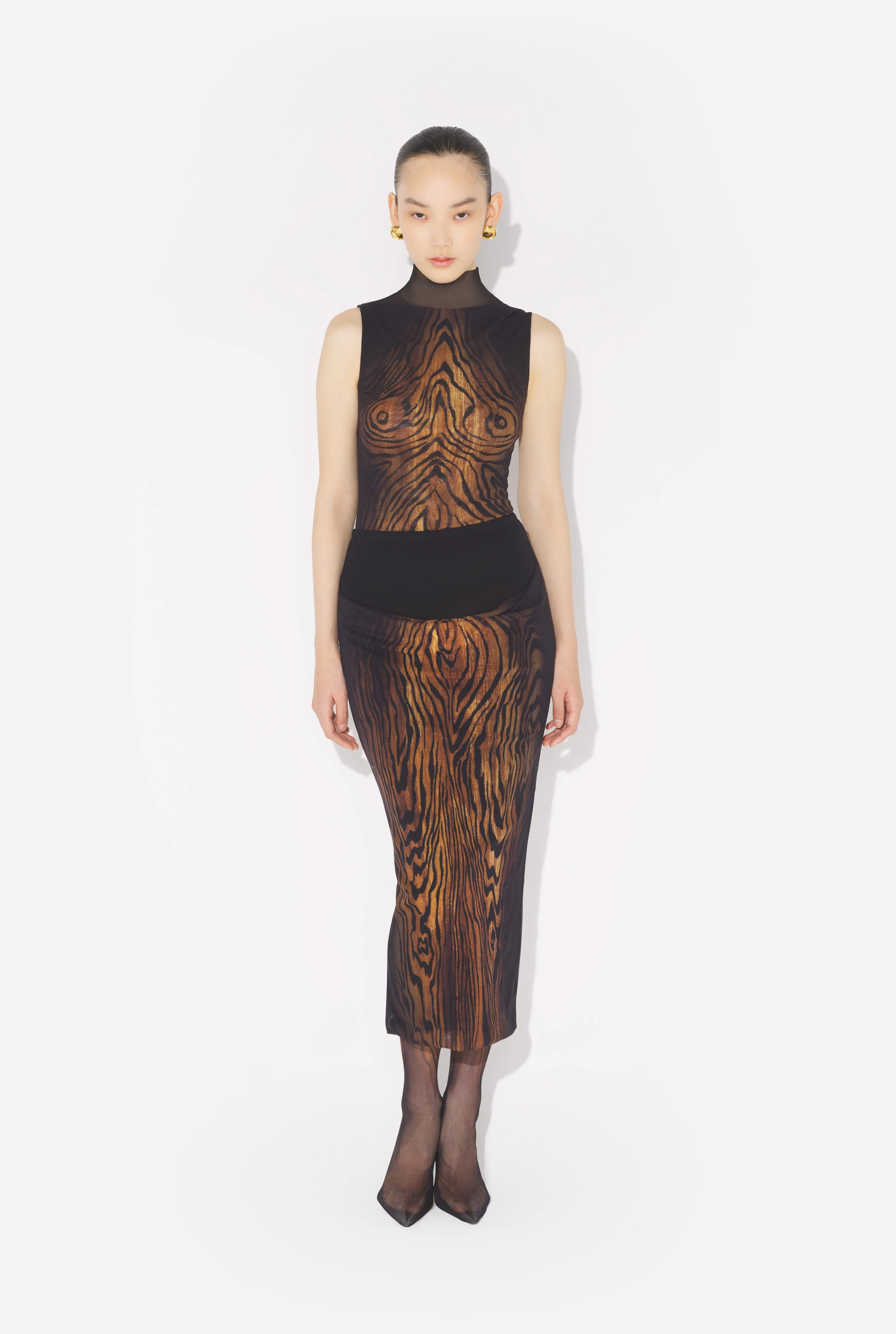 Long black draped tulle skirt with “Wood” print. PRODUCT DETAILS - Tight fit - Stretchy material - Elastic waistband - Ankle length - Tulle lining - Material: 100% polyamide - Made in Italy - Reference : 25/03-W-SK011-M002P-0060