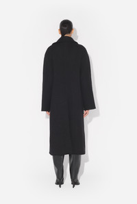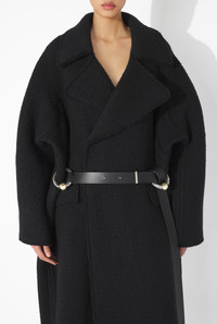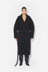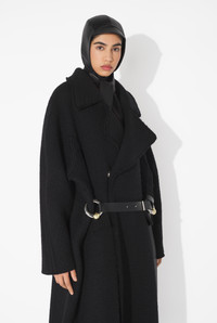 Long black wool coat with built-in tone-on-tone belt and piercing ring with Jean Paul Gaultier engraving. PRODUCT DETAILS - Loose fit - Double fastening: four snap buttons and belt - Two flap pockets - Removable piercing rings with Jean Paul Gaultier engraving - Imitation leather belt - Materials: 99% virgin wool, 1% elastane - Made in Italy - Reference : 25/03-U-OU008-W001-00