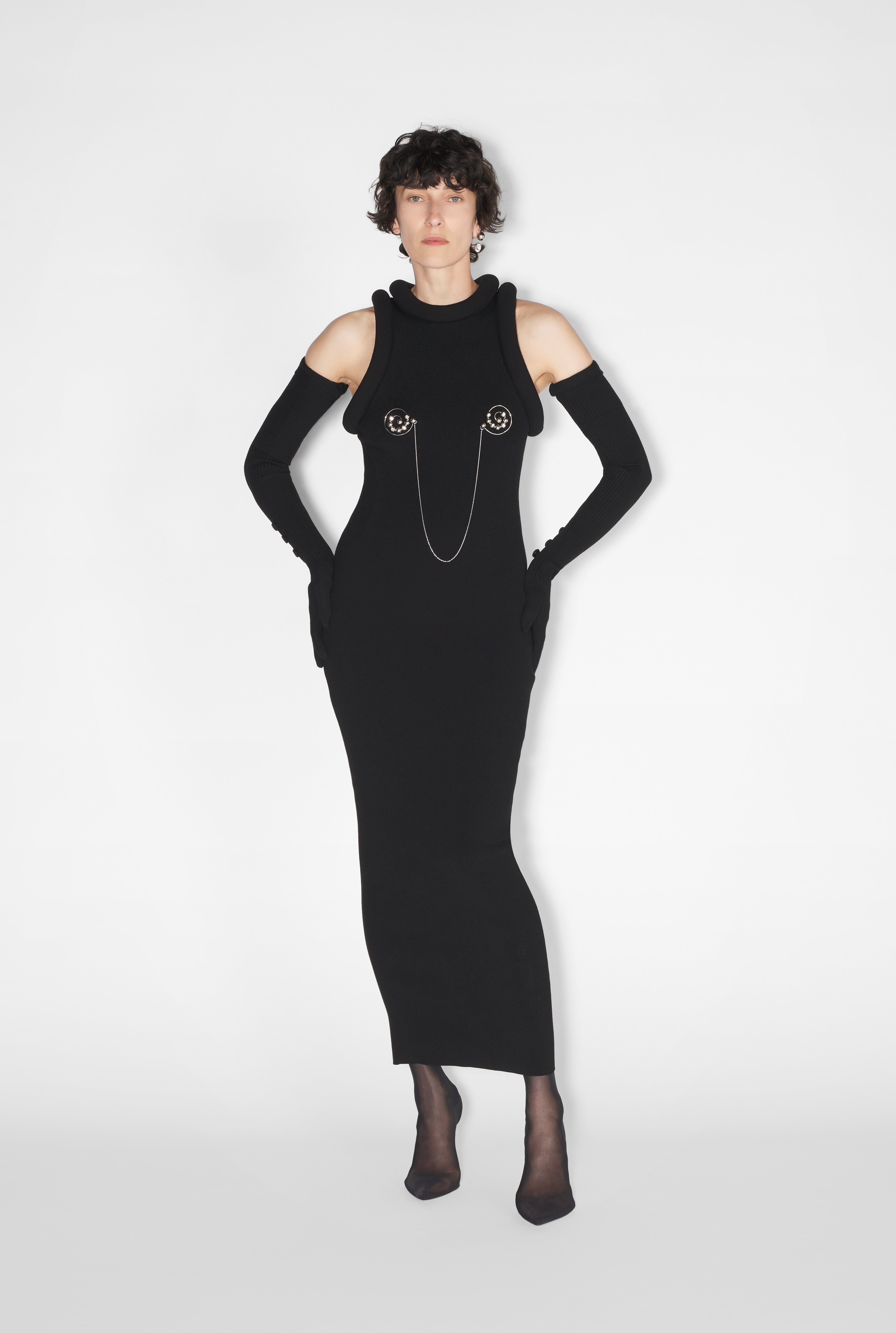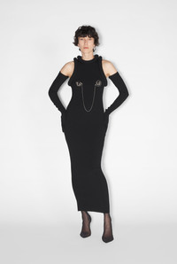 Fashion Fiction Collection Long black knit dress with 3D finishes and double spiral brooch. PRODUCT DETAILS - Oversized fit - Two flap pockets - Two raglan pockets - Engraved Jean Paul Gaultier metallic button fastening - Material: 100% cotton - Made in Italy