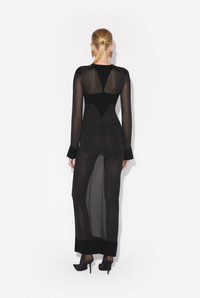 Long black knit dress with Jean Paul Gaultier logo detail below the collar. PRODUCT DETAILS - Tight fit - Crew neck - Ankle length - Main material: 100% viscose - Secondary materials: 70% viscose, 30% polyester - Made in Italy - Reference: 25/33-F-RO311-M083-00