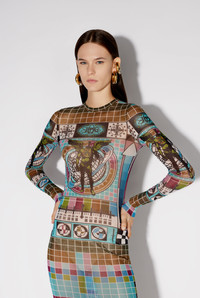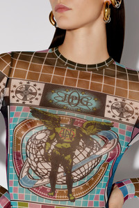 Gaultier TV Collection Long tulle dress with Mire print. PRODUCT DETAILS - Tight fit - Crew neck - Stretchy material - Long sleeves - Material: 100% polyamide - Made in Italy