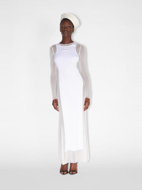 Fashion Fiction Collection Long-sleeved Petit Grand dress in white tulle with ribbed red cotton appliqué. PRODUCT DETAILS - Tight fit - Crew neck - Stretchy material - Ribbon logo on front - Main material: 100% polyamide - Secondary material: 100% cotton - Made in Italy