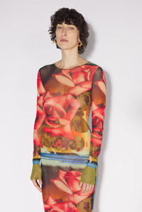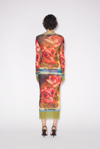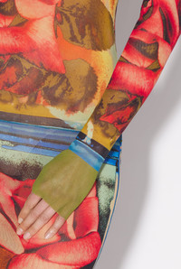 Très Gaultier Collection Long-sleeved tulle dress with red rose print. PRODUCT DETAILS - Close-fitting cut - Stretch material - Midi length - Crew neck - Material: 100% Polyamide - Made in Italy
