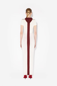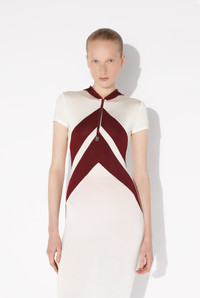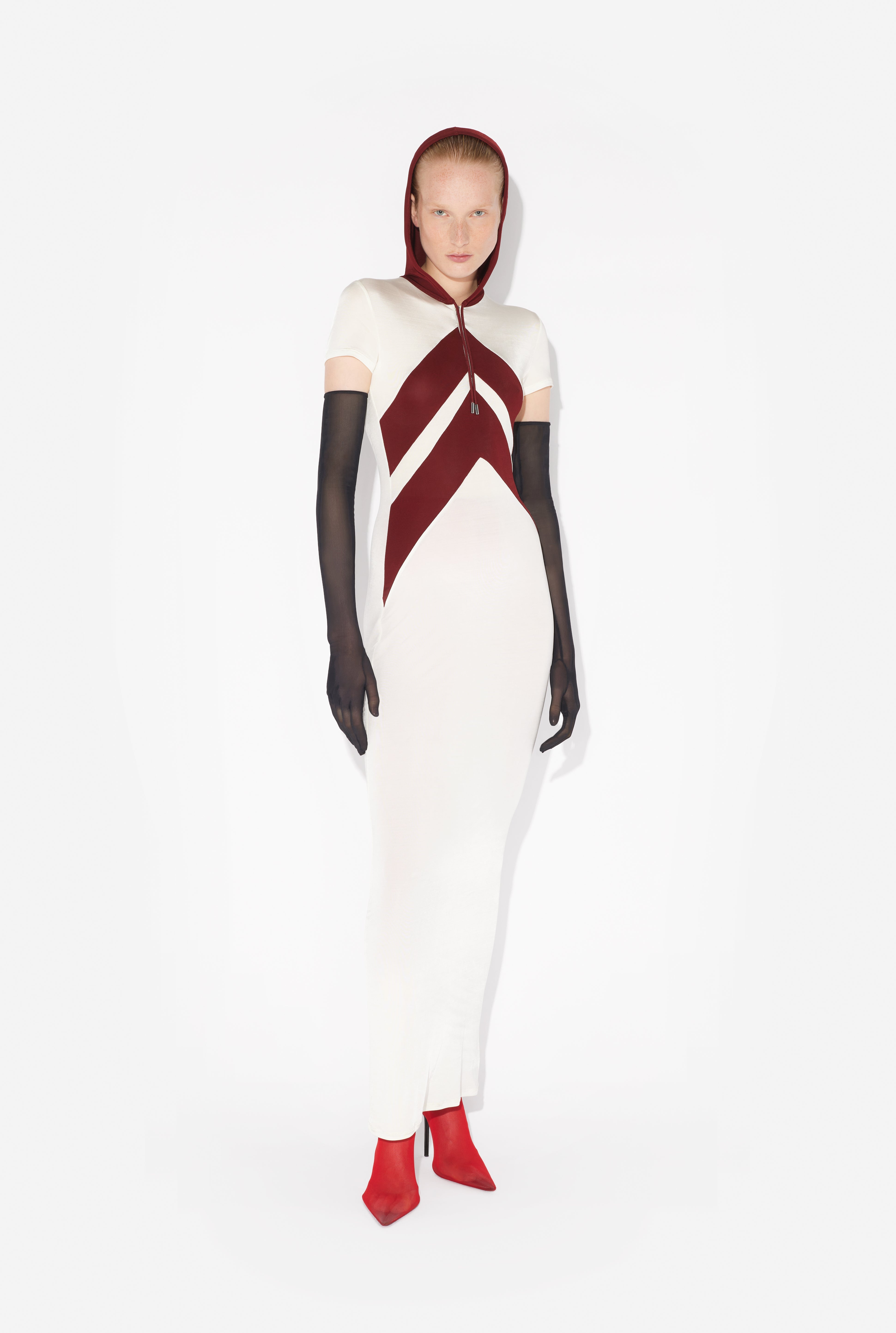 Long hooded dress in white viscose with burgundy chevron pattern. PRODUCT DETAILS - Tight fit - Invisible zip fastening in front - Drawstring tabs with Jean Paul Gaultier engraving - Materials: 95% viscose, 5% elastane - Made in France - Reference: 25/33-F-RO346P-J084-0128