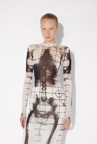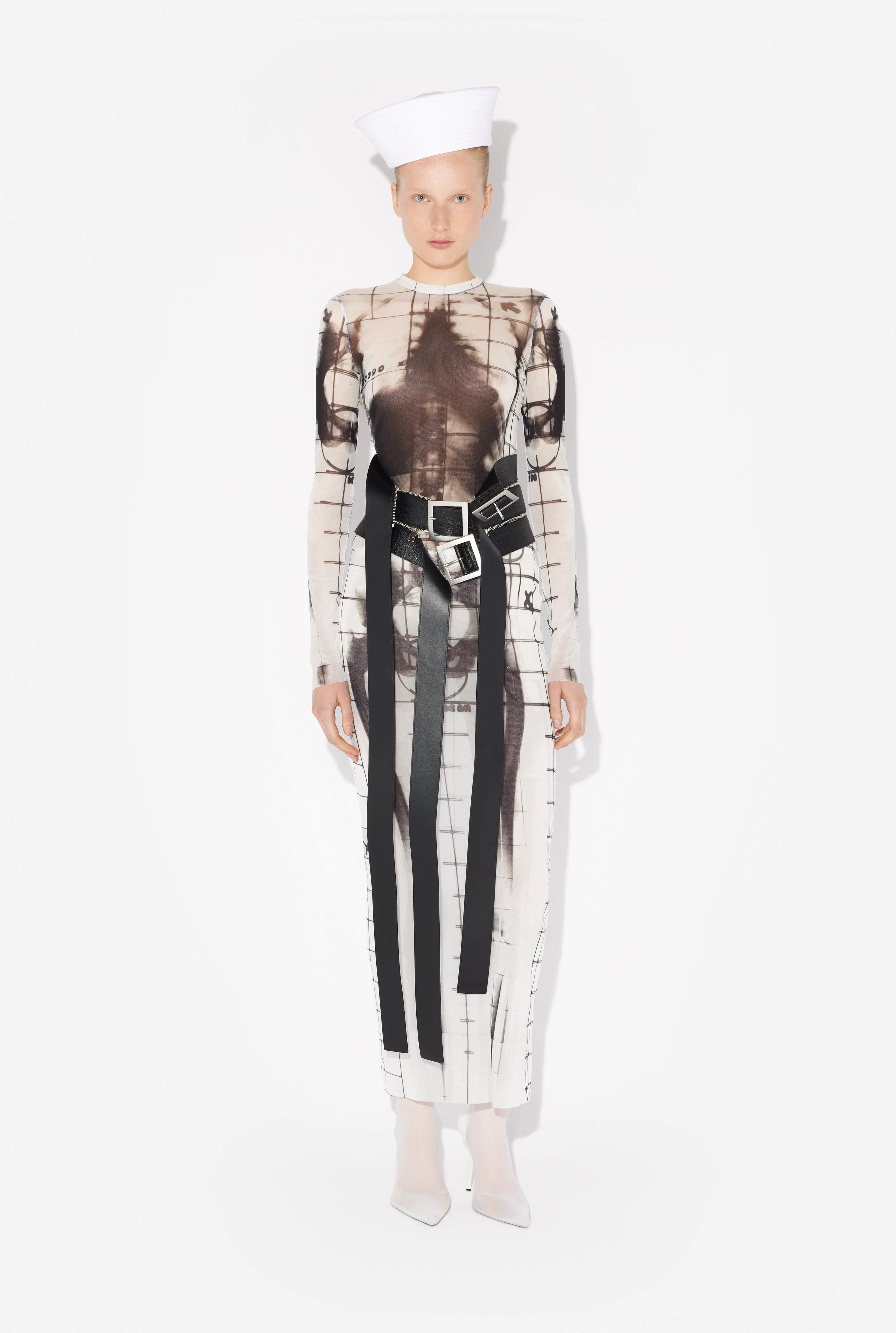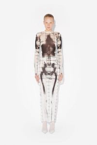 Long white tulle dress with “Squeletor” print. PRODUCT DETAILS - Tight fit - Crew neck - Stretchy material - Long sleeves - Material: 100% polyamide - Made in Italy - Reference: 25/33-F-RO309-T580-0100