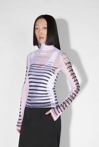 Fashion Fiction Collection Long-sleeved bi-material top with spandex and tulle in Marinière print. PRODUCT DETAILS - Tight fit - High neck - Stretchy material - Long sleeves - Main materials: 87% polyester, 13% elastane - Secondary materials: 94% polyamide, 6% elastane - Made in Portugal