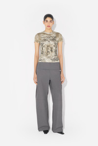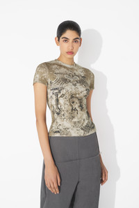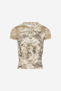 Beige ribbed cotton T-shirt with “Medaillon” print. PRODUCT DETAILS - Tight fit - Materials: 96% organic cotton, 4% elastane - Made in Portugal - Reference : 25/03-W-TO301-J013P-6965