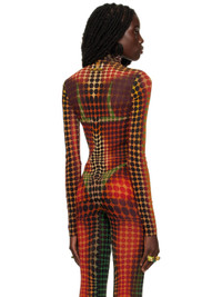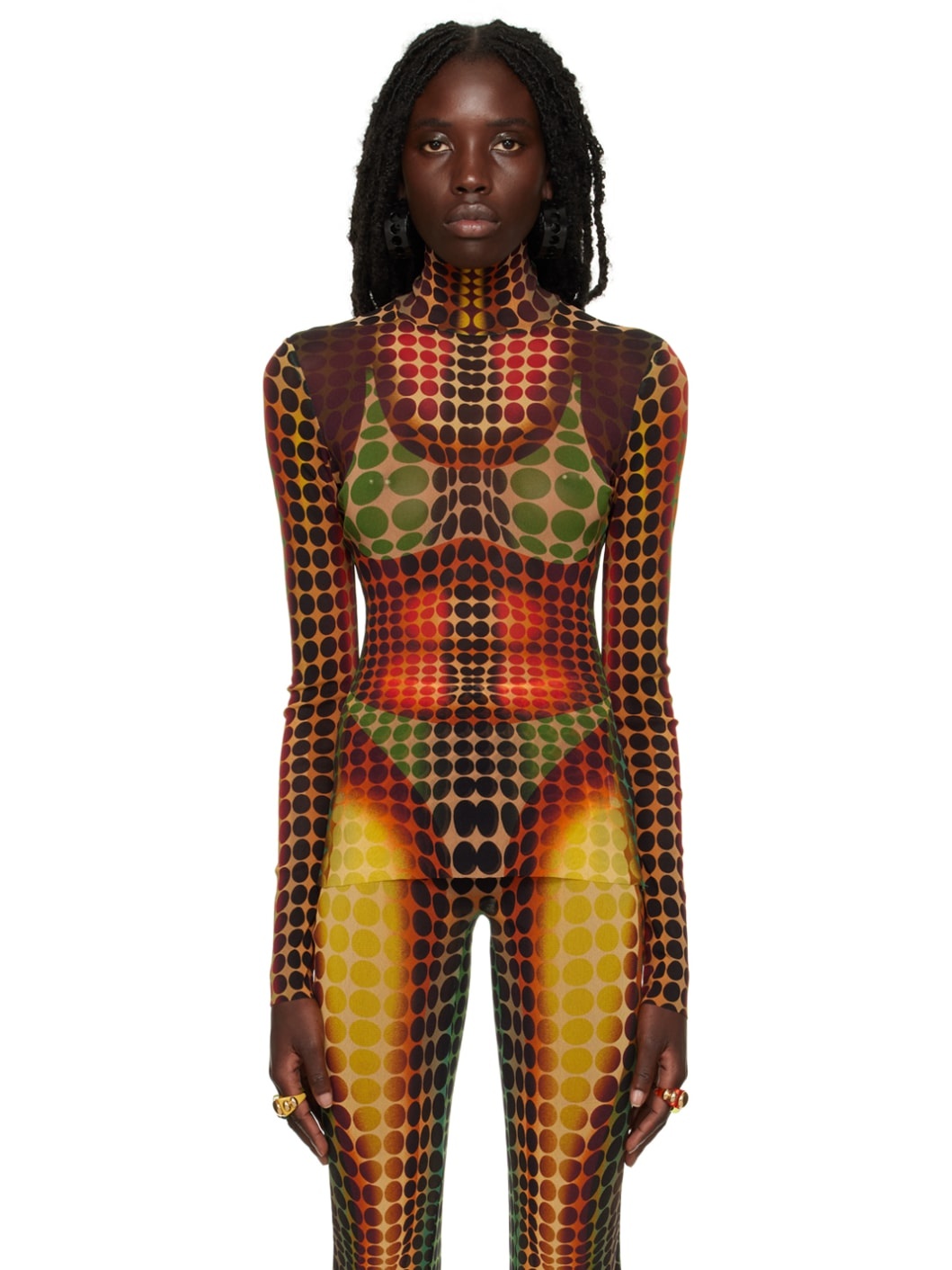 Semi-sheer nylon tulle turtleneck. Graphic pattern printed throughout. Supplier color: Orange/Blue/Brown 100% polyamide.