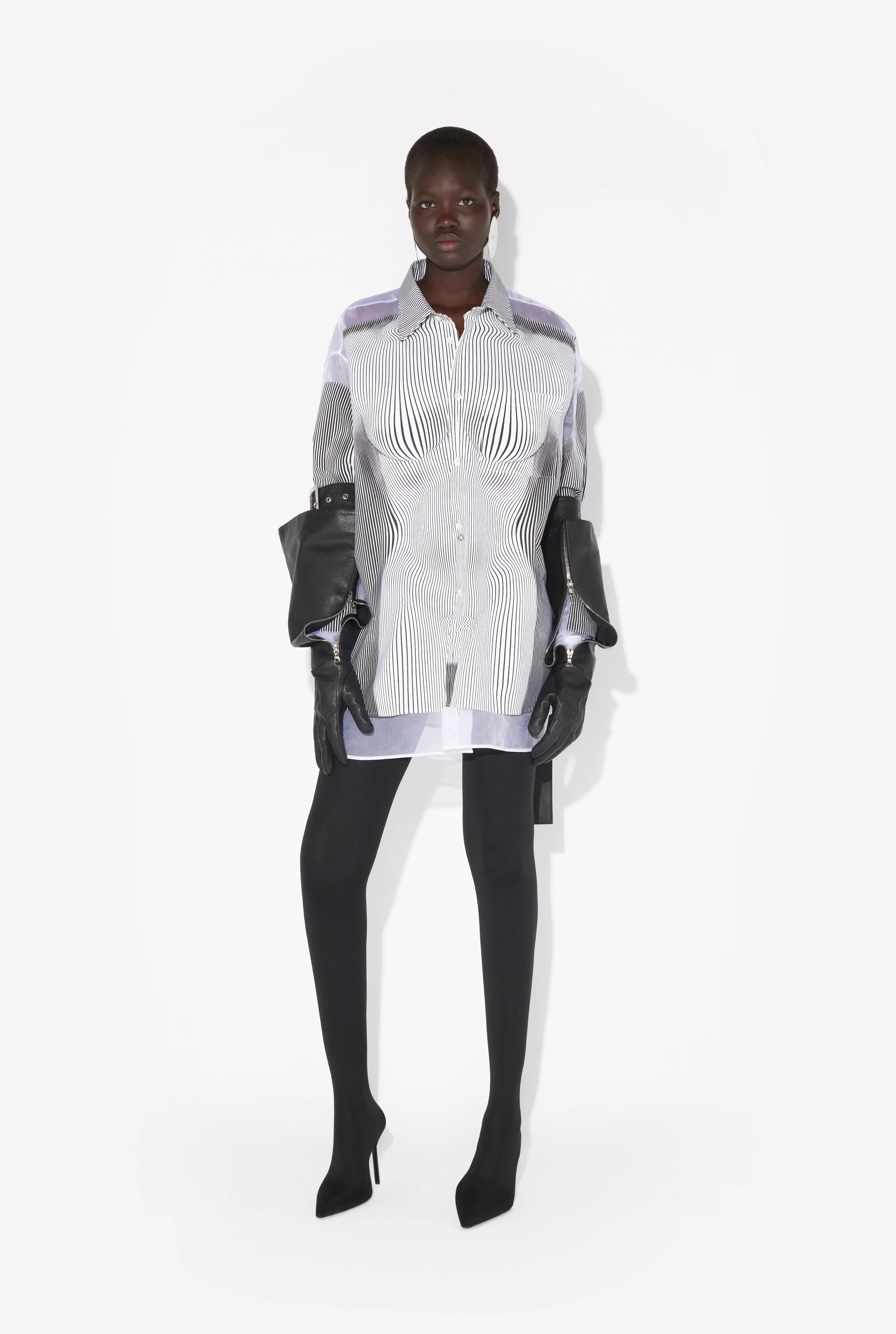 Black and white poplin shirt with “Pinstripe Body Morphing” print and silk see-through effects. PRODUCT DETAILS - Loose fit - Mother-of-pearl buttoned cuffs - Mother-of-pearl buttoned fastening - Mid-thigh length - Main material: 100% polyester - Secondary material: 100% silk - Made in Portugal - Reference : 25/33-F-CH080I-C566-0001
