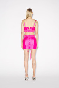 Tattoo Collection Iconic pink satin cone bra with lingerie-inspired topstitched details and lace-up back. PRODUCT DETAILS - Lace-up along middle of back - Concealed metal zip fastening - Adjustable straps - Elastic ribbing - Main materials: 97% polyester, 3% elastane - Secondary materials: 69% polyamide, 31% elastane - Made in England