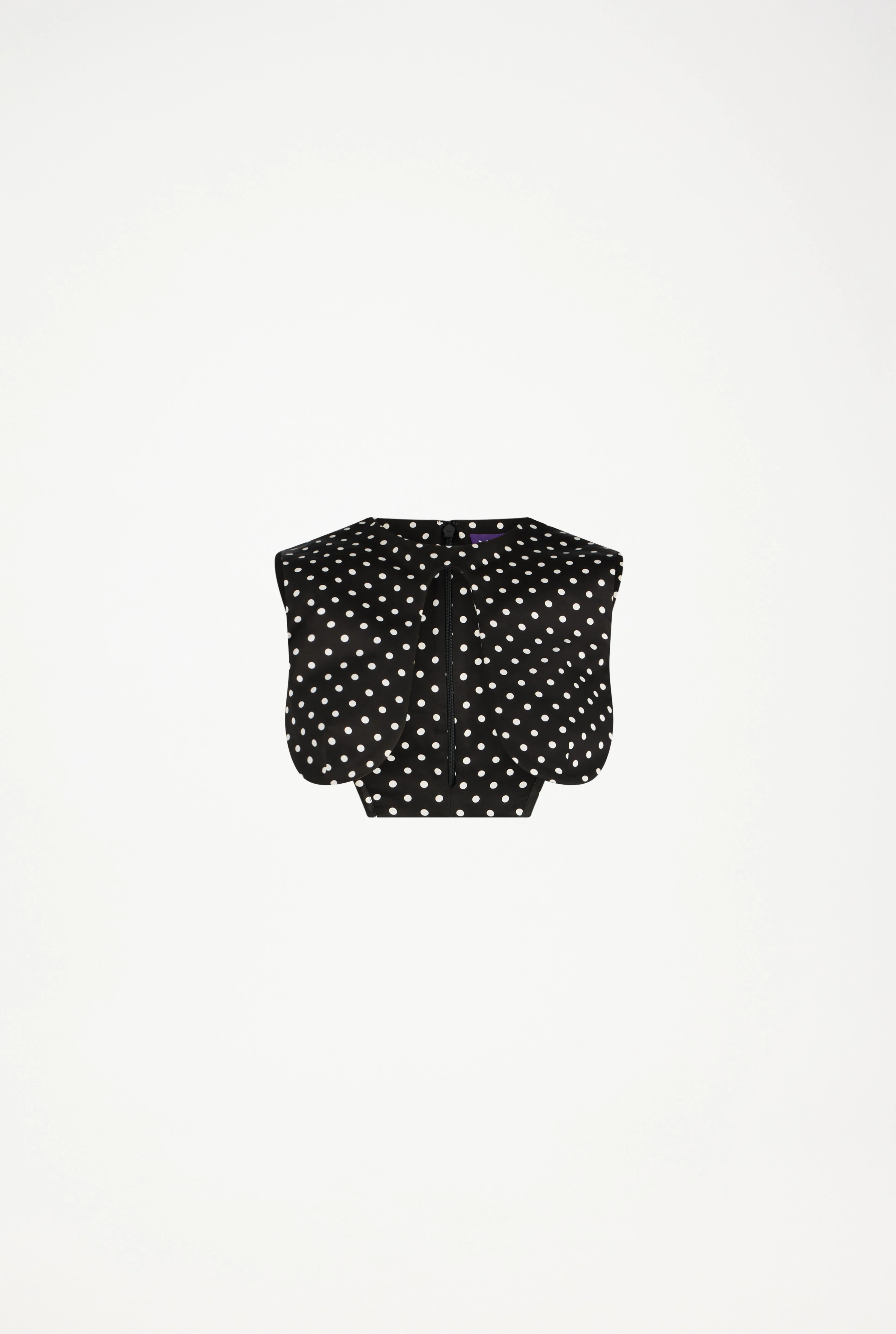 Black silk crop top with white polka dots and floating wire.