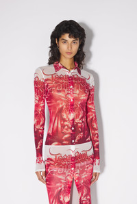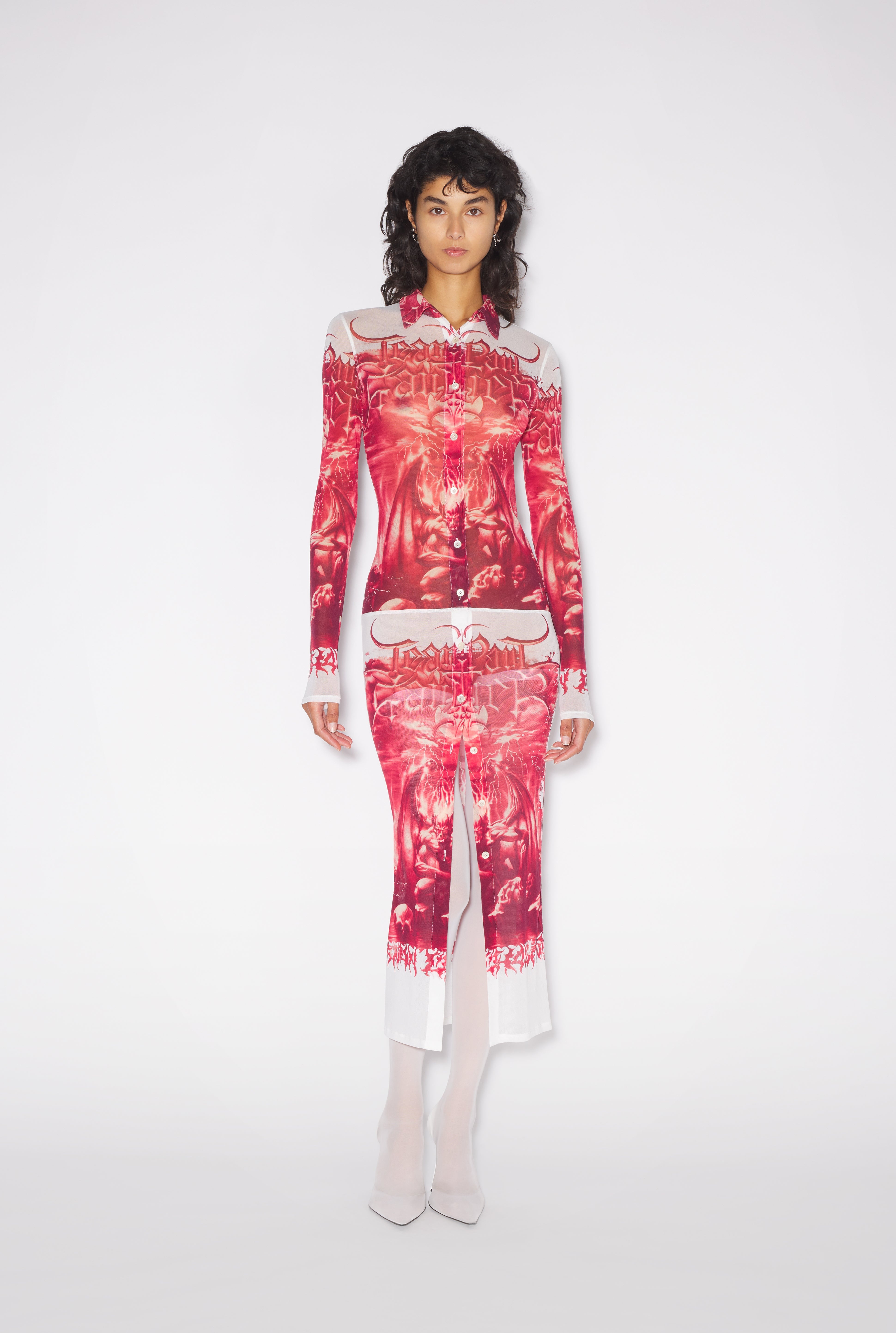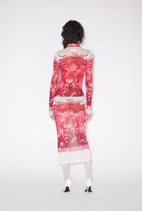 Très Gaultier Collection Mid-length tulle shirt-dress with red Diablo print. PRODUCT DETAILS - Close-fitting cut - Stretch material - French collar - Mid-length - Buttoned fastening - Material: 100% Polyamide - Made in Italy