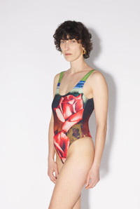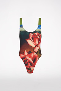 Très Gaultier Collection One-piece swimsuit with red rose print. PRODUCT DETAILS - Open back - Materials: 83% Polyamide, 17% Elastane - Made in Portugal
