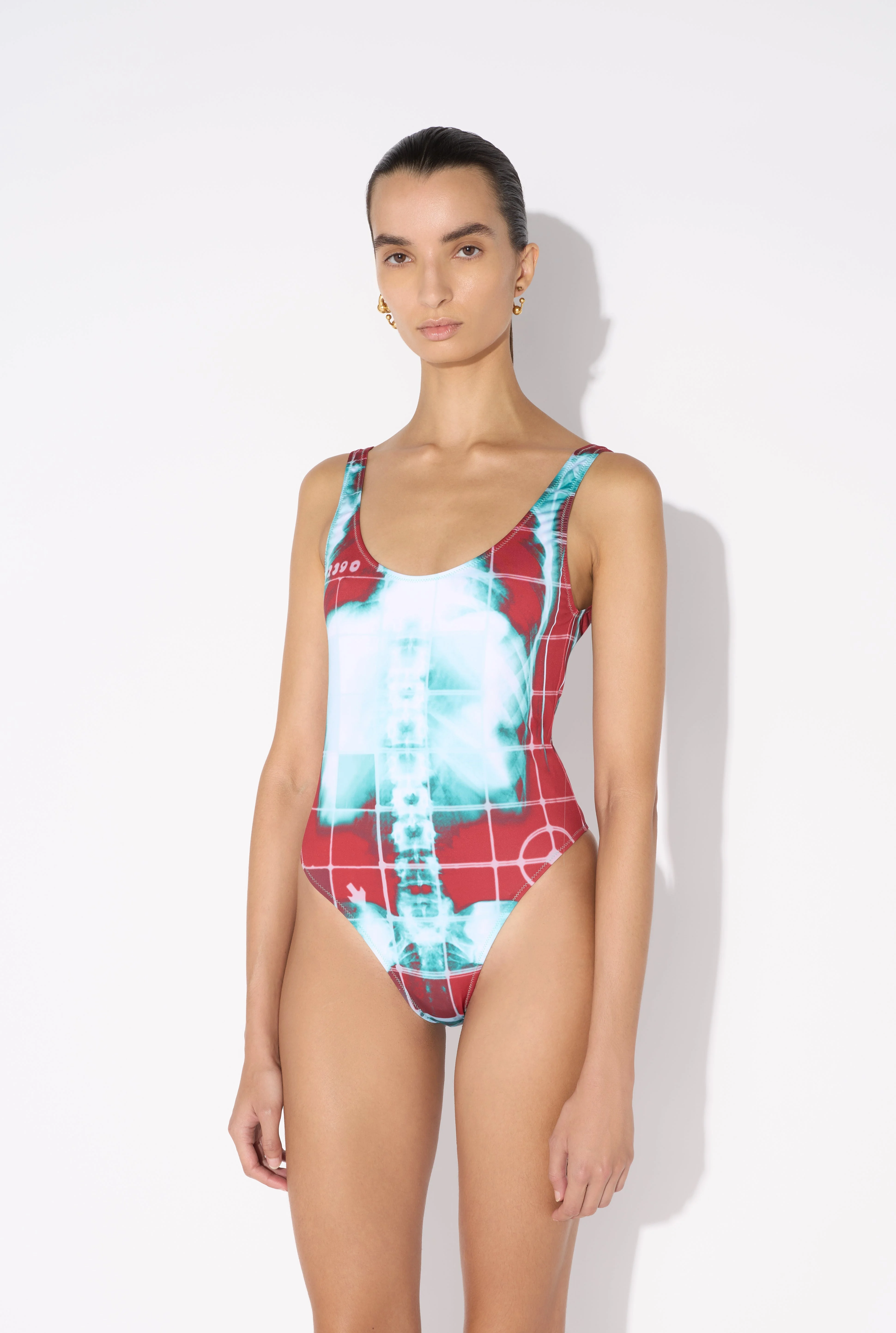 Red one-piece swimsuit with “Squeletor” print. PRODUCT DETAILS - Main materials: 83% polyester, 17% elastane - Panty lining: 90% polyamide, 10% elastane - Made in Portugal - Reference: 25/33-F-MB025-J575-3058