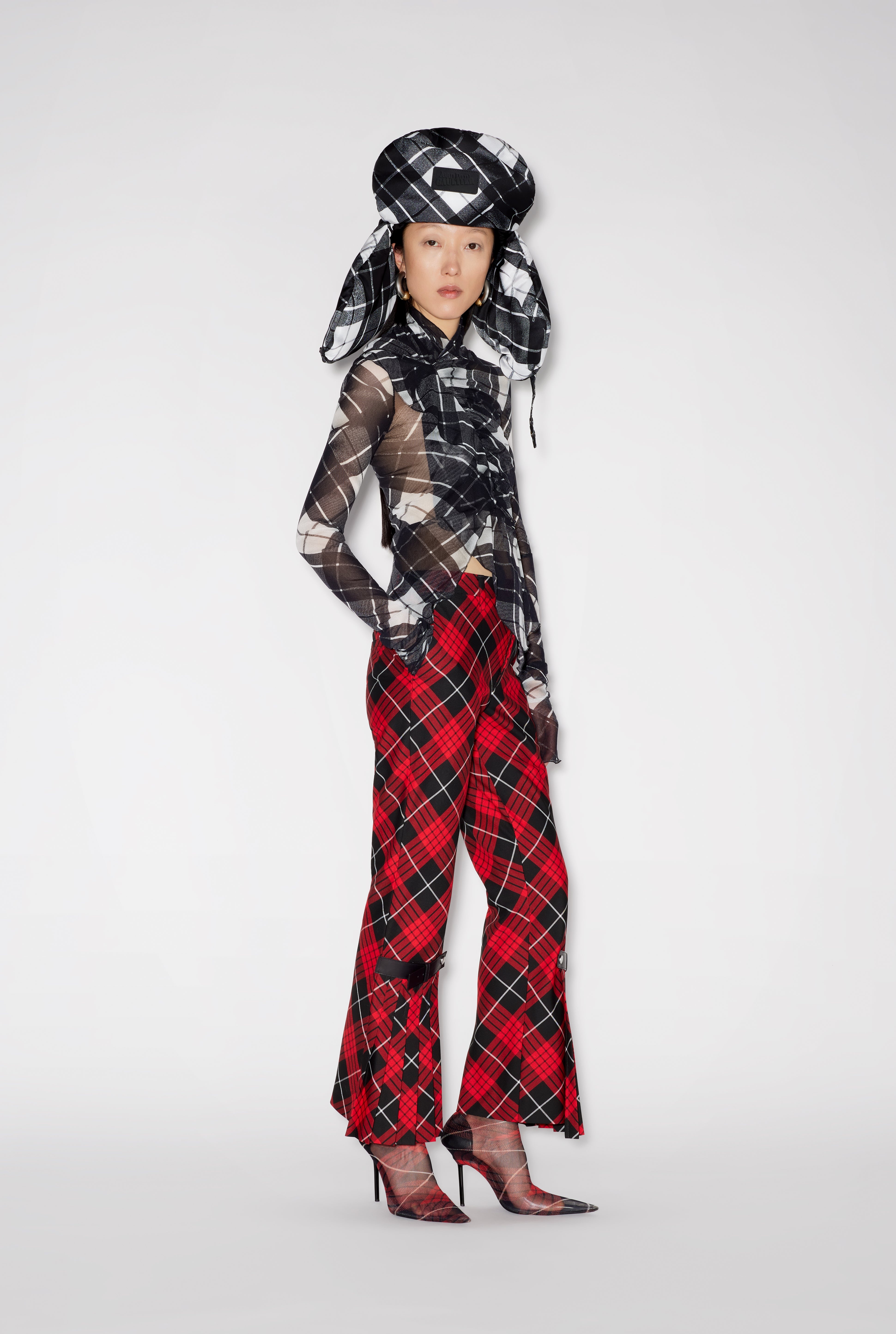 Gaultier TV Collection Nylon suit pants with Tartan print and pleated detail. PRODUCT DETAILS - Straight fit - Mid-rise waist - Hook fastening - Two raglan pockets - Two piped pockets - Belt loops - Adjustable belt buckle finishes - Materials: 65% polyester, 35% viscose - Made in Italy