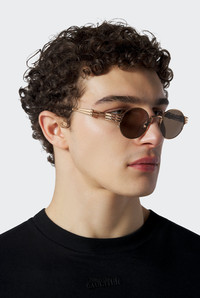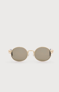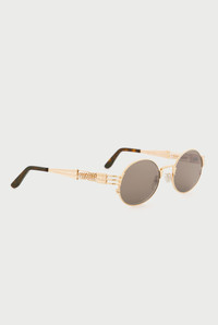 Eyewear Collection Sunglasses with round Pink Gold frames and metallic temples with spring detail. PRODUCT DETAILS - Round frames - Brown lens color - “Gaultier” engraved bridge - Category 3 UVA and UVB filter - Anti-glare treatment - Varnished metal alloy temples with gold-flash treatment - Mazzucchelli acetate temple tips - Materials: 75% Metal, 10% Acetate, 15% Glass - Made in France