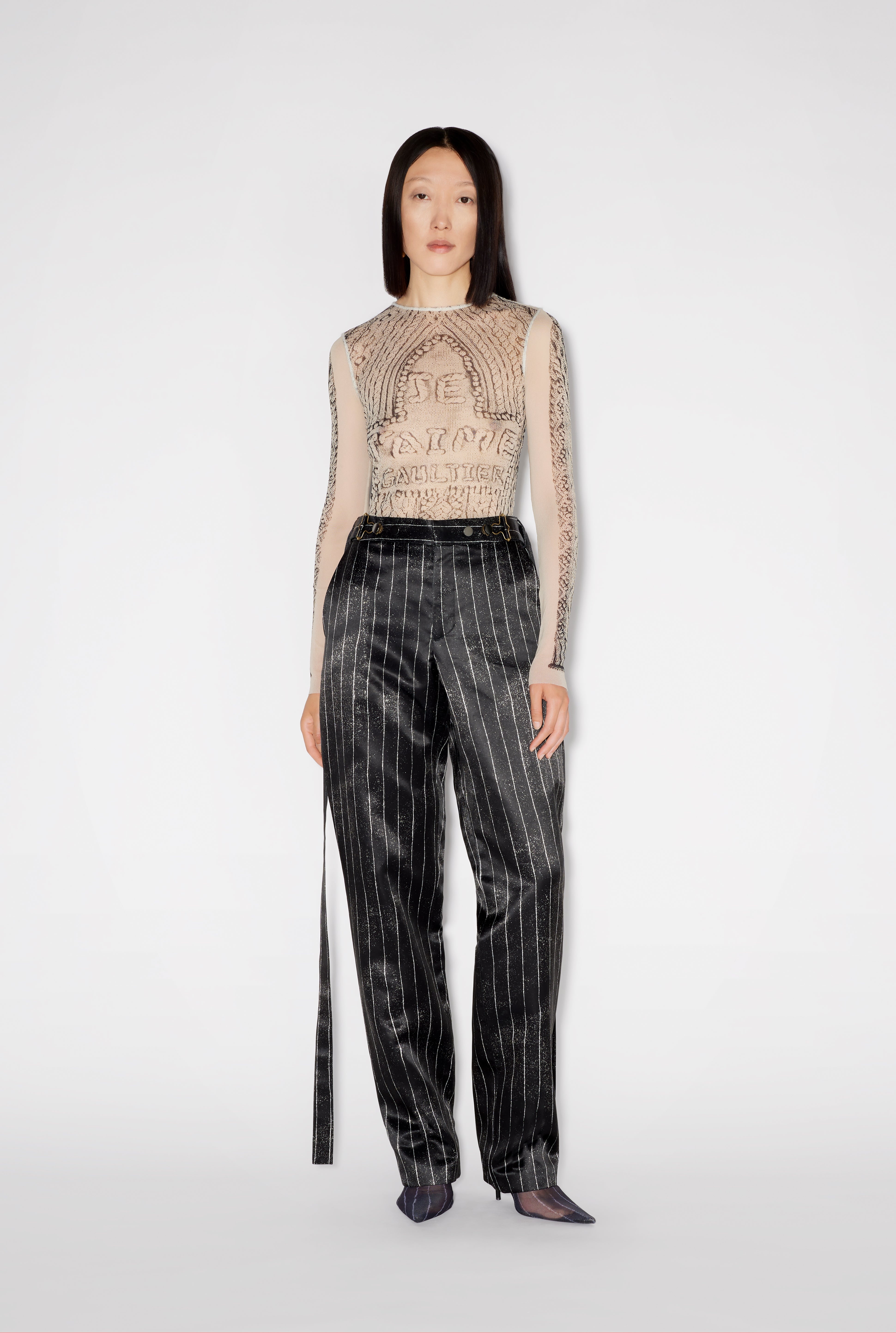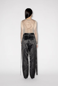 Gaultier TV Collection Satin suit pants with tennis-stripe print and long belt. PRODUCT DETAILS - Straight fit - Mid-rise waist - Hook fastening - Two raglan pockets - Two piped pockets - Material: 100% acetate - Lining: 100% cotton - Made in Italy