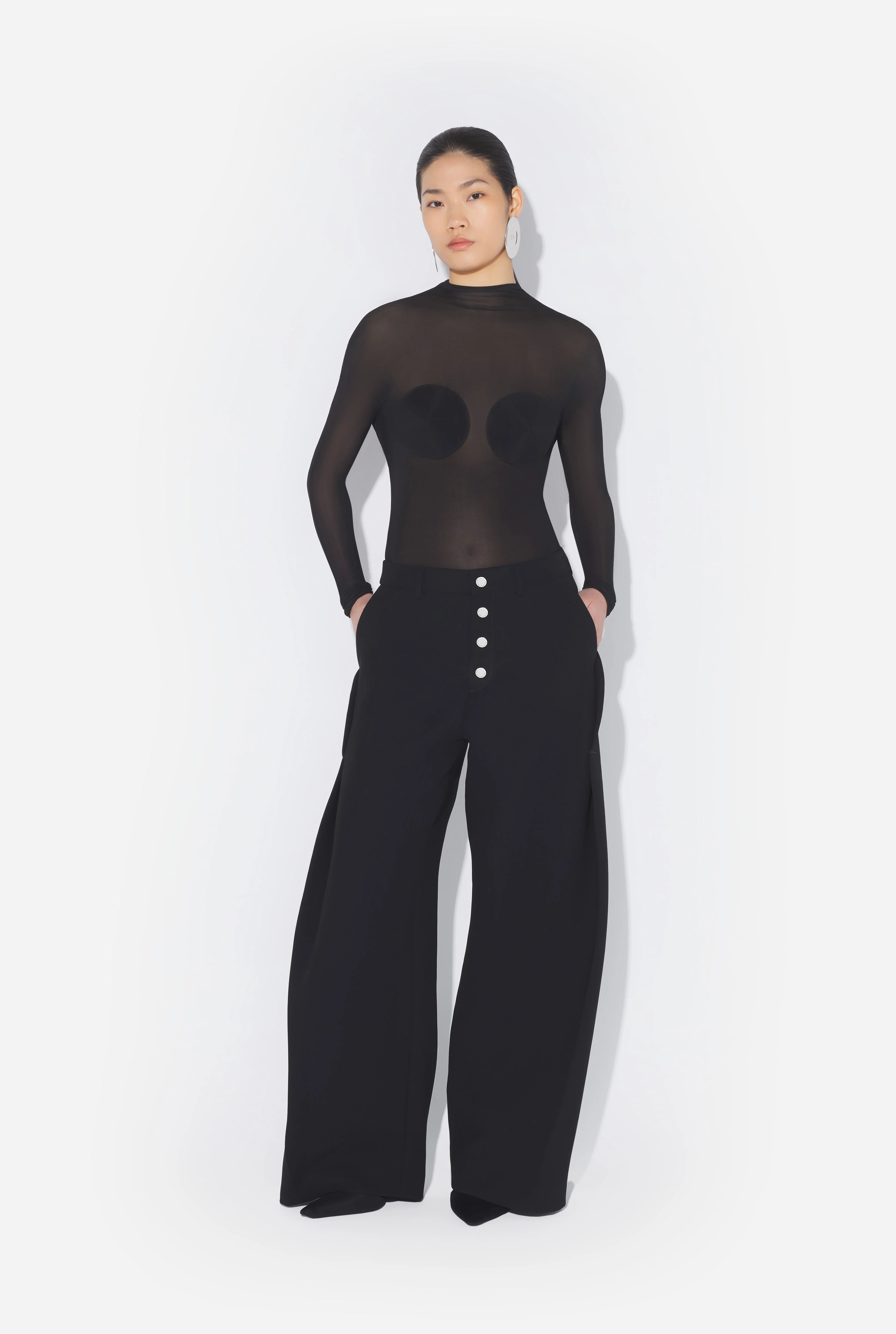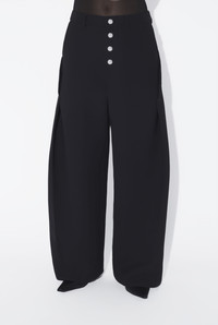 Black crepe pants with contrasting button detail in front. PRODUCT DETAILS - Loose fit - Two pockets - Engraved Jean Paul Gaultier metallic button fastening. - Main material: 100% polyester - Lining: 100% cotton - Made in Italy - Reference: 25/34-F-PA194-C081-00