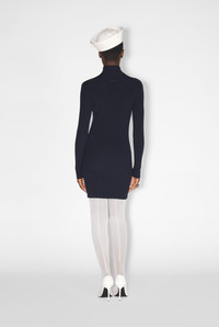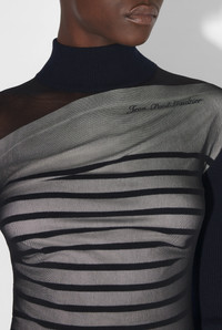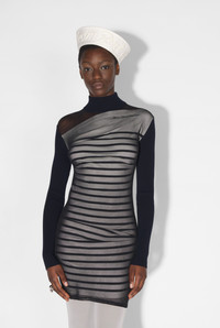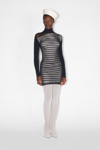 Fashion Fiction Collection Short, long-sleeved Marinière dress in knit and tulle. PRODUCT DETAILS - Slim fit - High neck - Wool sleeves and ribbing - Main materials: 70% viscose, 30% polyester - Secondary material: 100% polyamide - Made in Italy