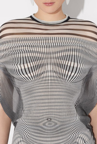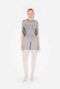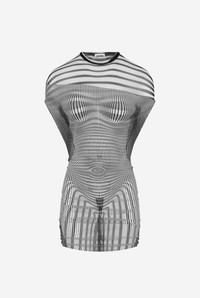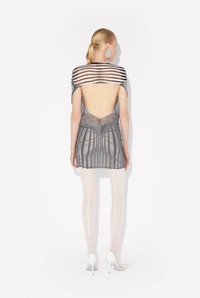 Short open-backed ecru tulle dress, black stripes on body and draped tulle on front. PRODUCT DETAILS - Tight fit - Crew neck - Stretchy material - Material: 100% polyamide - Made in Italy - Reference: 25/33-F-RO358-T578-0100
