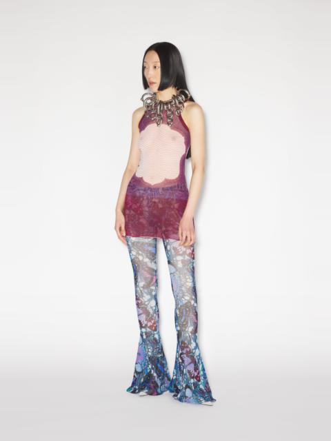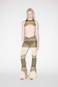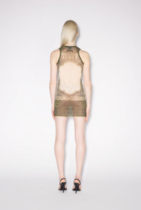 Très Gaultier Collection Short sheer green and beige tulle sleeveless dress with cartouche print detail. PRODUCT DETAILS - Close-fitting cut - Stretch material - Crew neck - Material: 100% Polyamide - Made in Italy