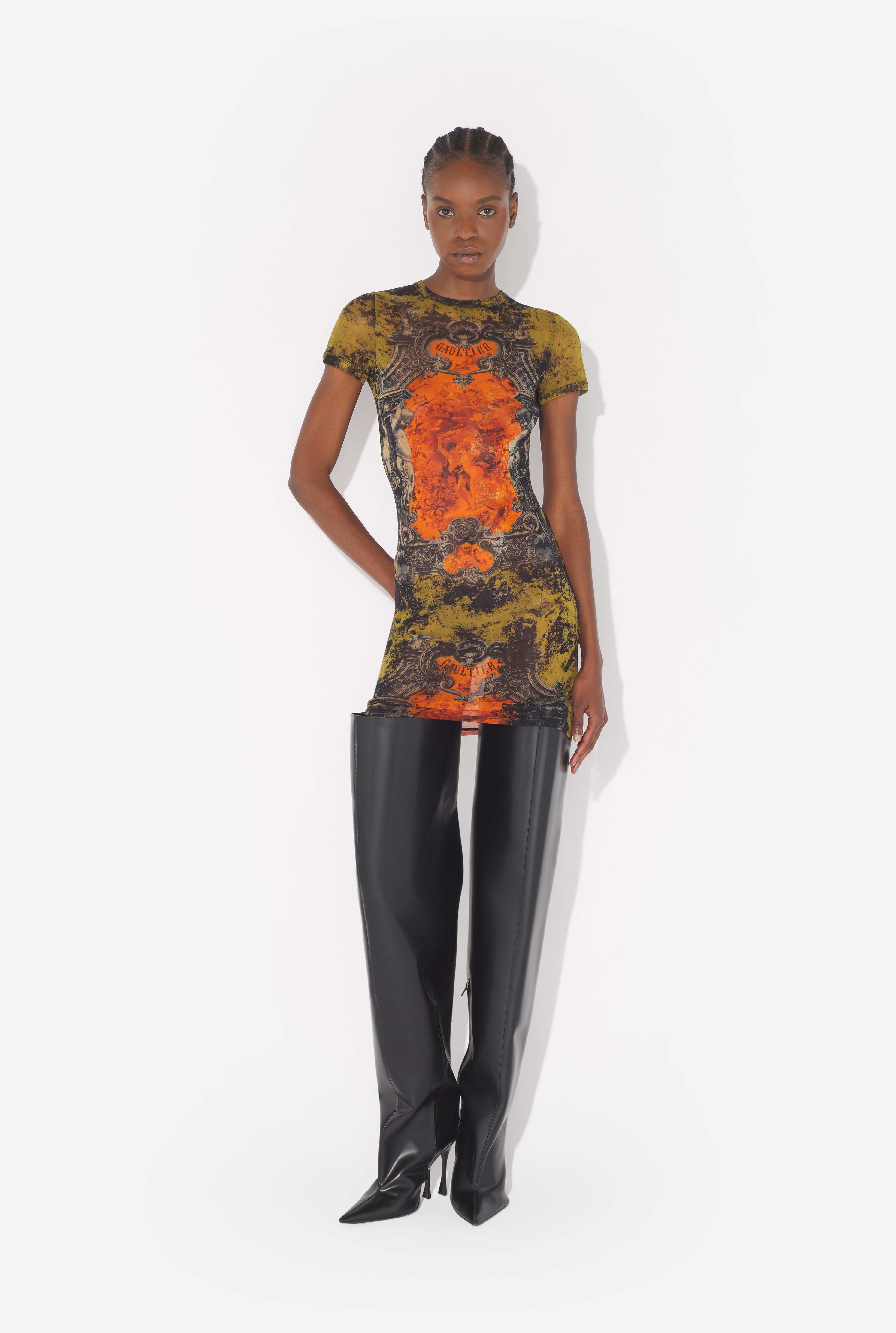 Short khaki tulle dress with “Medaillon” print. PRODUCT DETAILS - Tight fit - Crew neck - Stretchy material - Material: 100% polyamide - Made in Italy - Reference : 25/03-W-DR024-M006P-004115