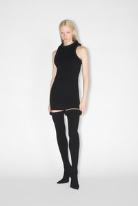 Fashion Fiction Collection Short black knit dress with 3D finishes. PRODUCT DETAILS - Fitted cut - Crew neck - Materials: 70% viscose, 30% polyester - Made in Italy