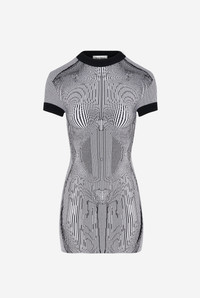 Short black and white “Morphing Pinstripes” jacquard dress. PRODUCT DETAILS - Tight fit - Crew neck - Ribbed neckline and cuffs - Materials: 70% viscose, 30% polyester - Made in Italy - Reference: 25/33-F-RO374-M084-0100