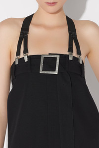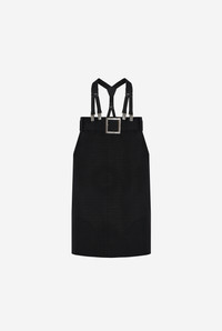 Short belted skirt in black virgin wool with leather strap details. PRODUCT DETAILS - Semi-slim fit - Two piped pockets - Metallic belt buckle - Material: 100% virgin wool - Made in Italy - Reference: 25/33-F-RO323-C084-00