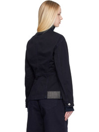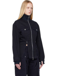 Non-stretch denim jacket. · Rib-knit mock neck · Two-way zip closure · Flap pockets at chest · Slits at hem · Thumbhole at inset rib-knit cuffs · Locker loop at back collar · Logo patch at back hem · Unlined · Logo-engraved silver-tone hardware Supplier color: Blue Body: 100% cotton. Trim: 3% elastane, 7% polyamide, 90% polyester. Made in Italy 252808F060006
