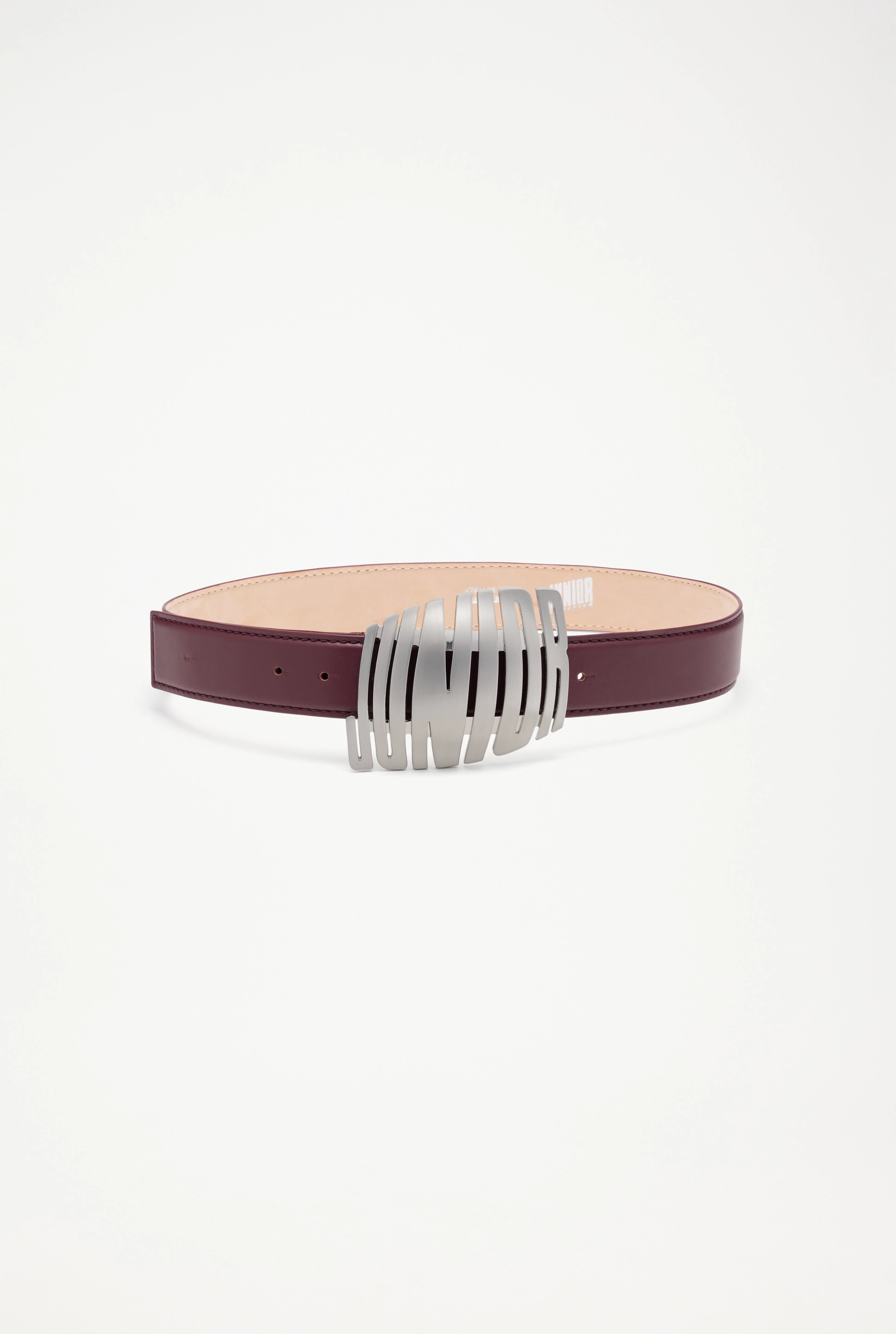 Straight burgundy leather belt with metal “Junior” logo buckle.