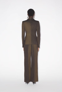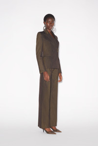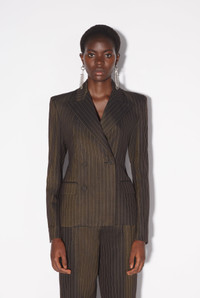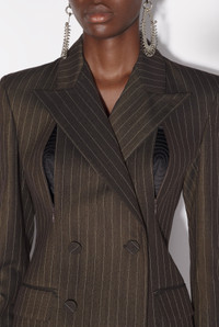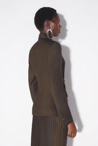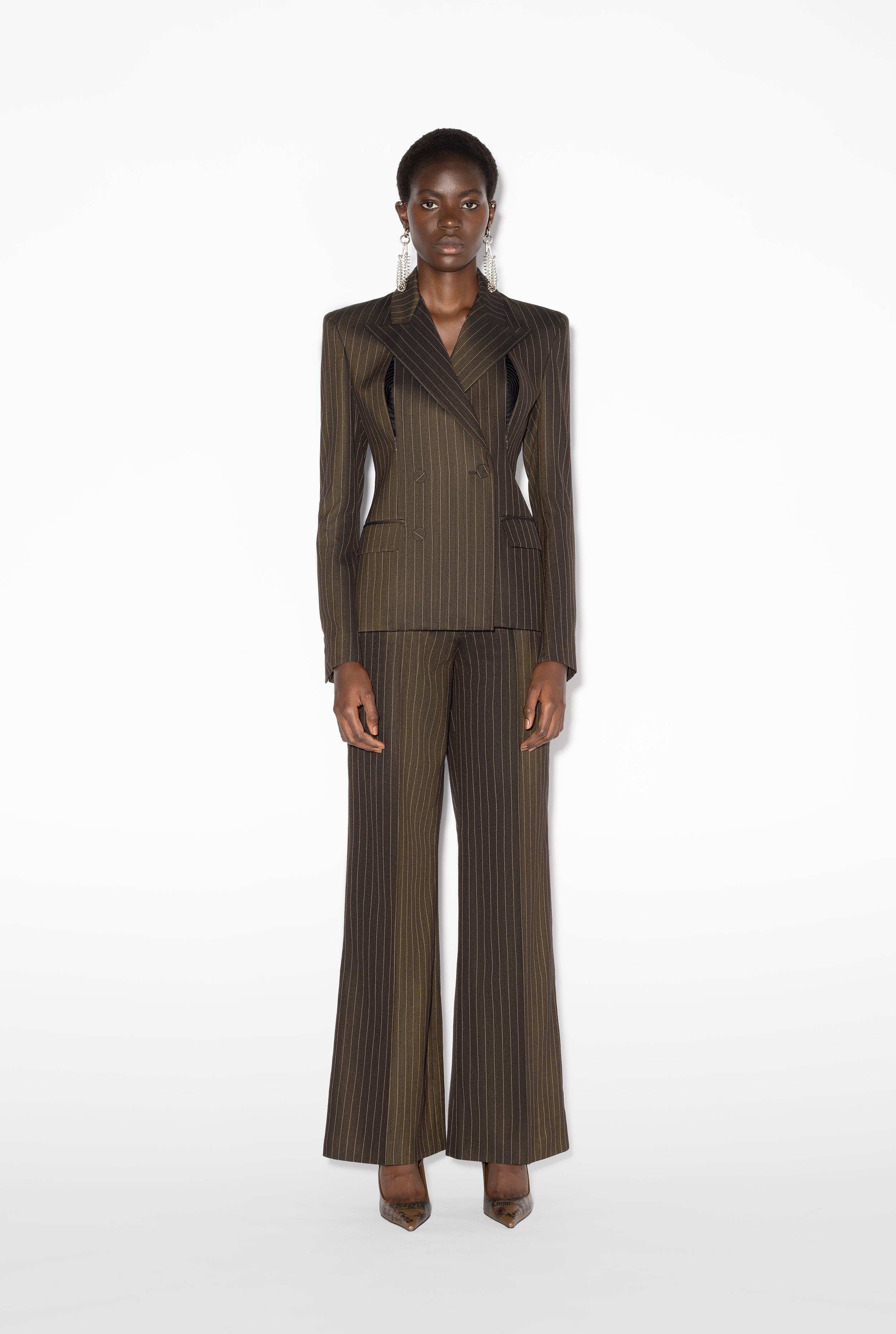 Tattoo Collection Brown wool suit jacket with ecru-colored tennis stripes and open details on chest. PRODUCT DETAILS - Slim fit - Shoulder pads - Fabric button fastening - Zipped openings on chest - Bra not included - Materials: 85% wool, 14% viscose, 1% polyester - Lining: 100% viscose - Made in Italy